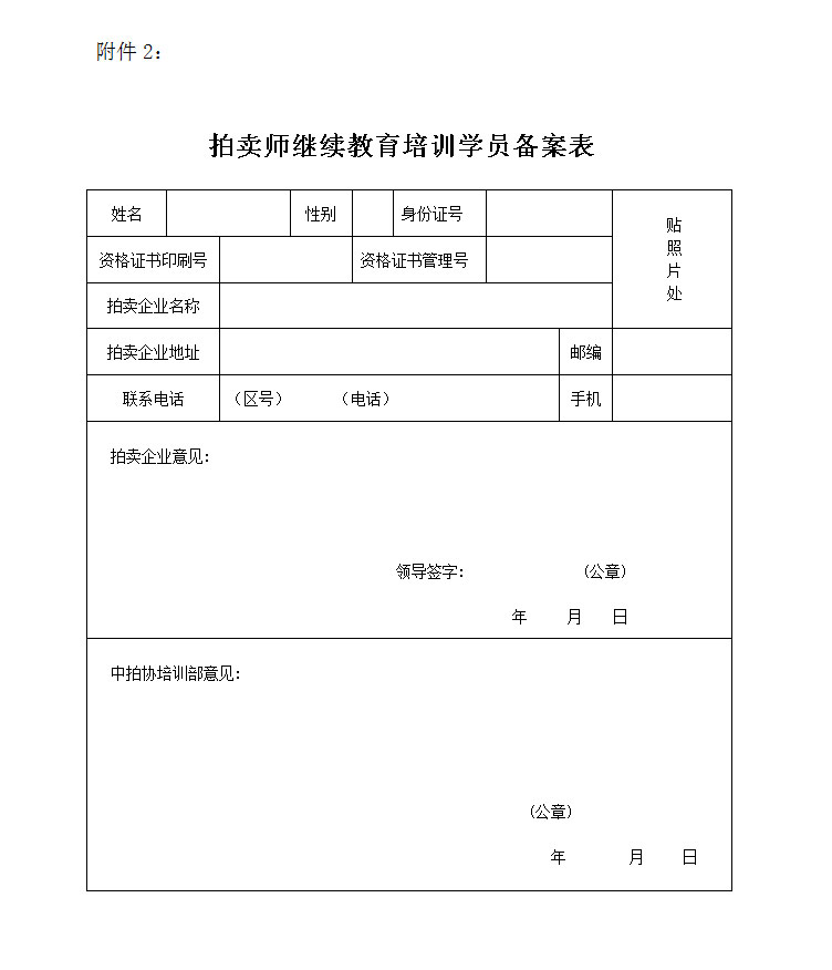 拍賣師繼續(xù)教育培訓(xùn)學(xué)員備案表