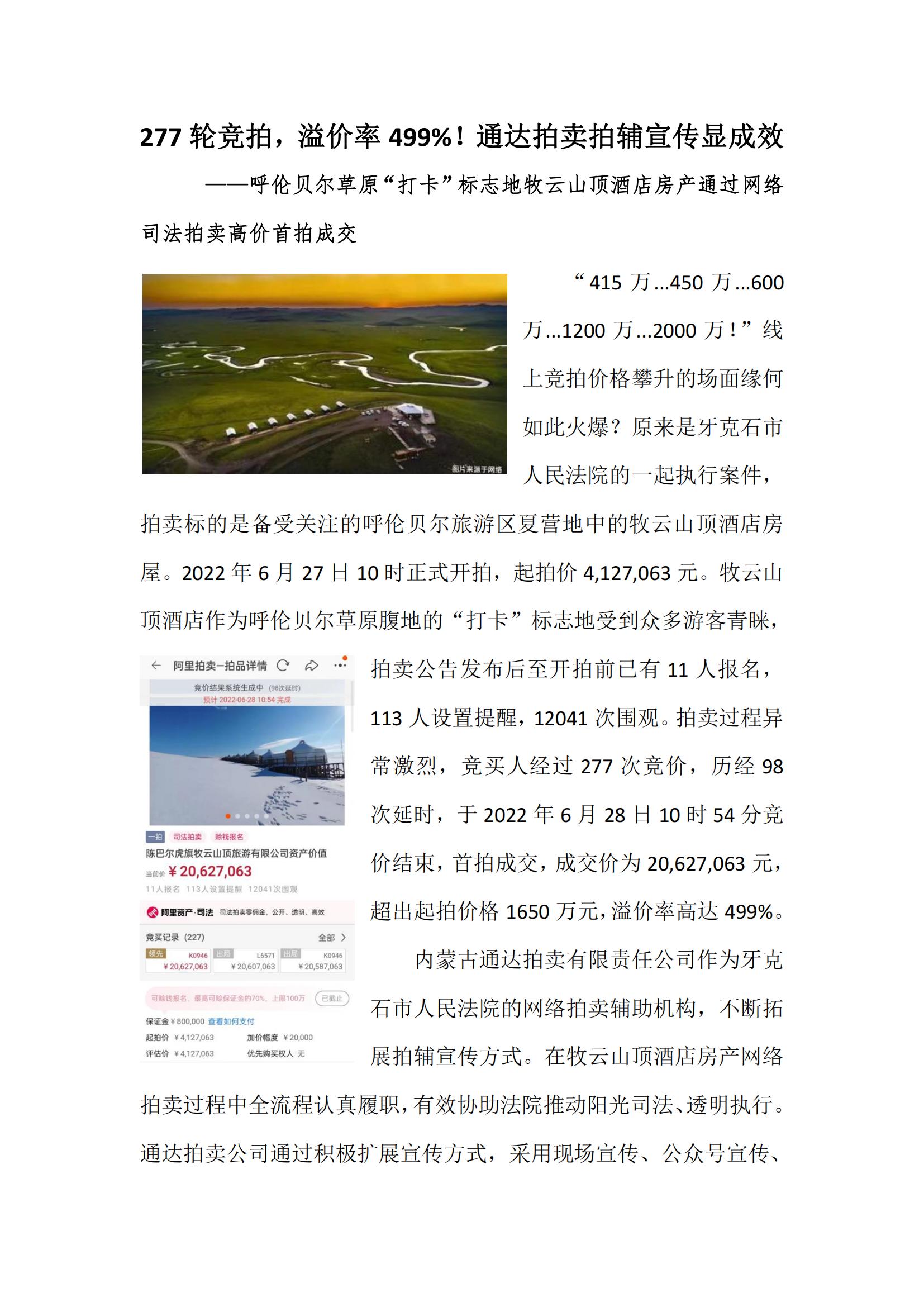 專業(yè)拍賣機(jī)構(gòu),助力司法拍賣 我區(qū)拍賣企業(yè)開(kāi)始入圍法院司輔機(jī)構(gòu)已經(jīng)兩年有余,在入圍的這兩年多時(shí)間里,拍賣企業(yè)作為專業(yè)的拍賣機(jī)構(gòu)不斷的完善自身,利用我們的專業(yè)助力司法拍賣,提高司法拍賣的成交額。拍賣企業(yè)的專業(yè)就是拍賣,作為司法輔助機(jī)構(gòu),我們拍賣企業(yè)更能夠從委托方角度出發(fā),從標(biāo)的角度出發(fā),從競(jìng)買人的角度出發(fā),深刻的了解各方的切實(shí)需求。也更可以找到標(biāo)的的亮點(diǎn)從而非常專業(yè)的對(duì)其進(jìn)行宣傳,通過(guò)拍賣企業(yè)本身的客戶資源以及通過(guò)網(wǎng)站、公眾號(hào)、宣傳視頻等多種新的宣傳自媒體齊發(fā)力,已經(jīng)突破了地域限制,使得更多的潛在買家可以看到和了解標(biāo)的。同時(shí)專業(yè)的拍賣公司有著強(qiáng)大的拍賣實(shí)力和風(fēng)控能力,對(duì)于拍賣過(guò)程中出現(xiàn)的問(wèn)題以及未出現(xiàn)的問(wèn)題都會(huì)做到提前準(zhǔn)備預(yù)案,這樣為標(biāo)的的最后成交奠定了專業(yè)而扎實(shí)的基礎(chǔ)。因?yàn)樾g(shù)業(yè)有專攻,讓專業(yè)的人做專業(yè)的事更能讓他們發(fā)揮所長(zhǎng),讓價(jià)值得到最大化,也能盡快的找到解決辦法,從而節(jié)省成本。 昨天收到來(lái)自內(nèi)蒙古通達(dá)拍賣有限責(zé)任公司的好消息,位于呼倫貝爾草原“打卡”標(biāo)志地的“牧云山頂酒店”房產(chǎn)網(wǎng)絡(luò)司法拍賣通過(guò)該企業(yè)的輔助宣傳,網(wǎng)絡(luò)拍賣產(chǎn)生了激烈的競(jìng)價(jià),經(jīng)過(guò)277 輪競(jìng)價(jià)后,最終以 20,627,063 元成交,溢價(jià)率達(dá)到 499%。 這便是一個(gè)很好的例子,希望我們?nèi)珔^(qū)的拍賣企業(yè)都能充分發(fā)揮自身專業(yè)優(yōu)勢(shì),助力司法拍賣,在這一領(lǐng)域開(kāi)疆?dāng)U土,以此為契機(jī),從點(diǎn)到線再到面的全面發(fā)展。